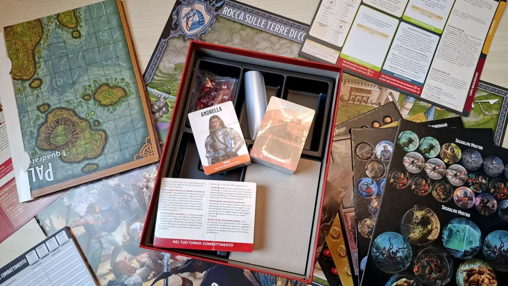 - Altri materiali di supporto – menu della locanda, lettera del castellano, inventario di oggetti, armi e armature del mercante, token punti ferita, potere, gemme, monete d’oro, mostri, trappole, terreno, PNG.